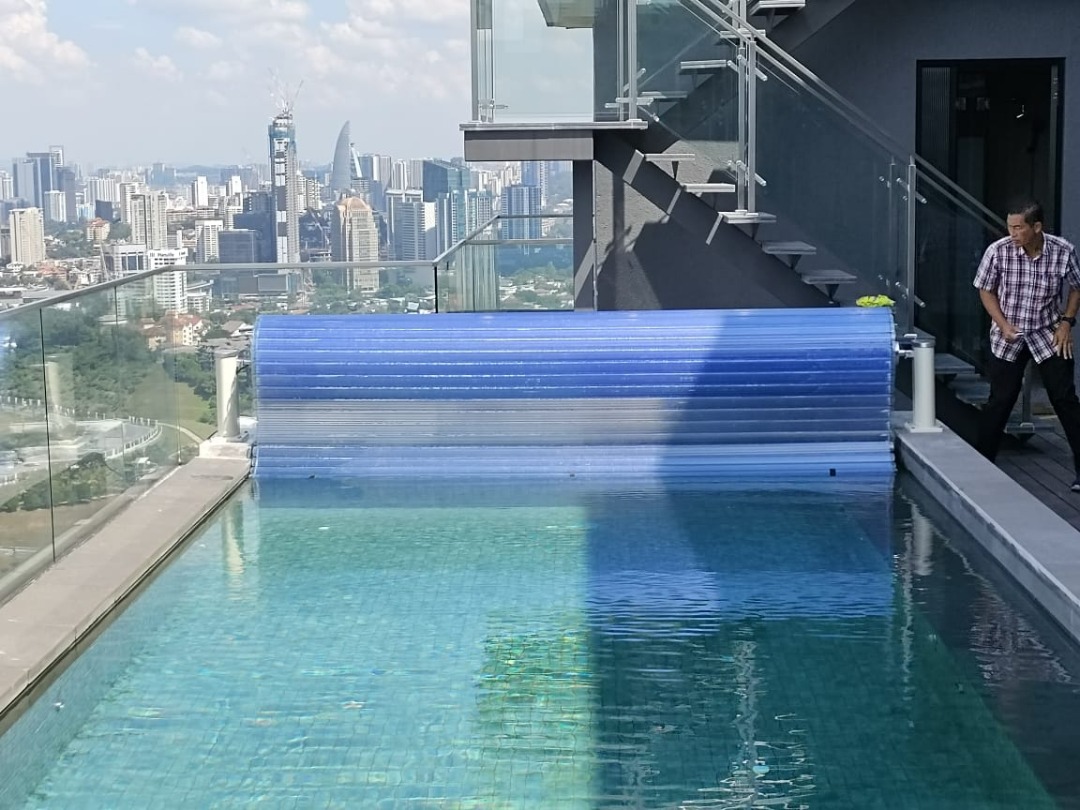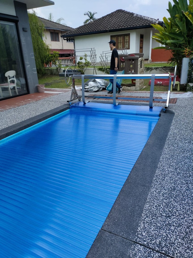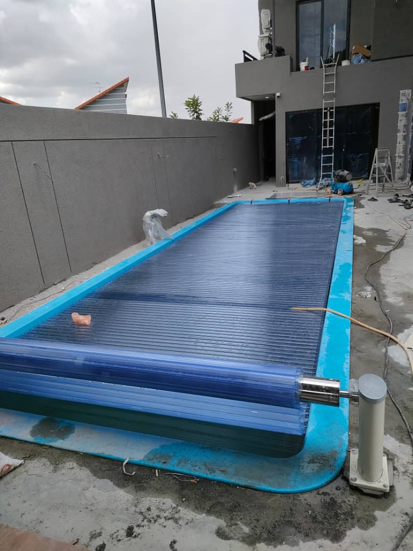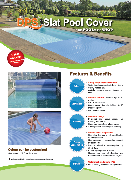 De Pool Roller A cover that are like shutters which rolls in and out like a carpet, covering your pool.